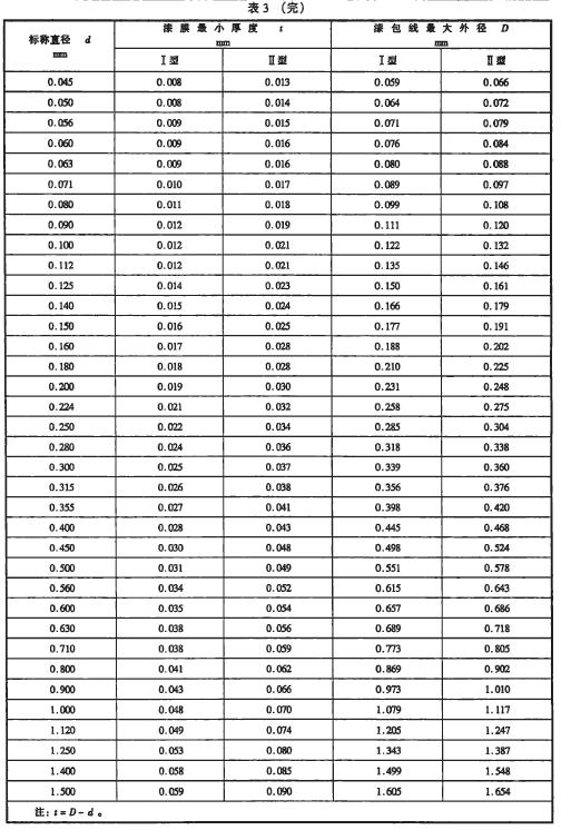漆包線最大外徑和最小漆膜厚度應(yīng)符合表3的規(guī)定。